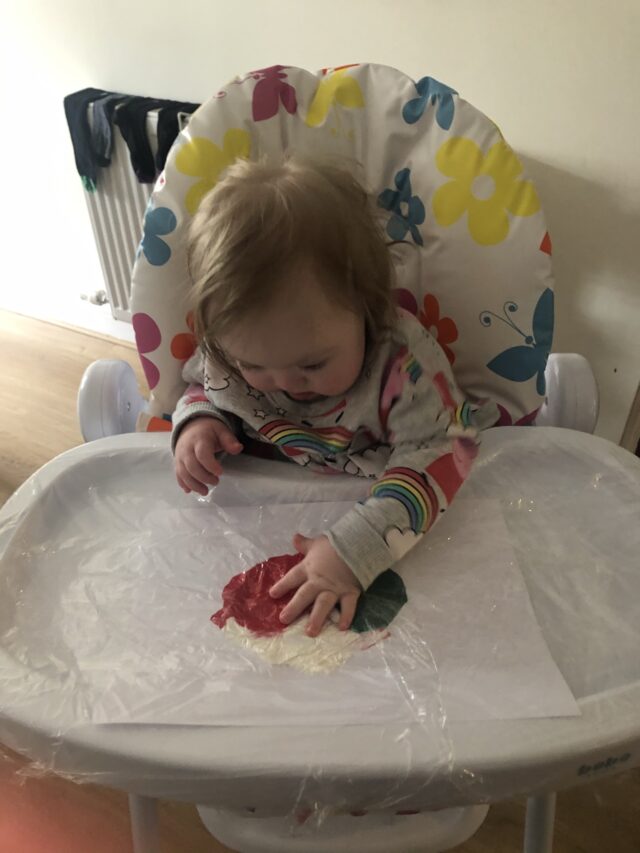 The second photo shows our beautiful girl doing a spot of ‘mess free’ painting as part of a sensory activity.